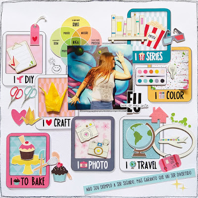Fui montando tudo depois que posicionei a foto e os cards, partindo do assunto de cada um deles e usei bastante chipboard, elemento que estou gostando muito!